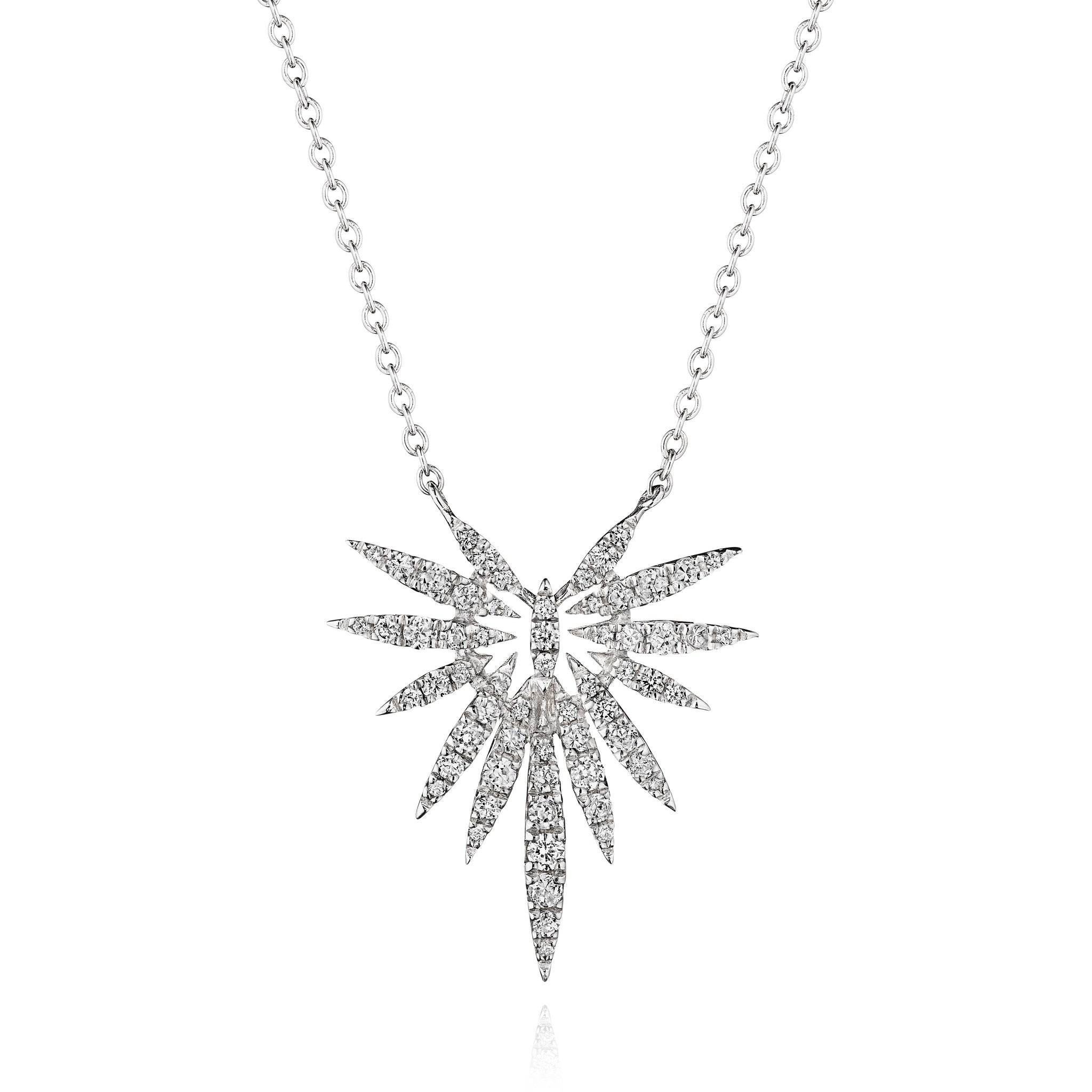 A flying burst of diamonds sparkles at the collarbone.